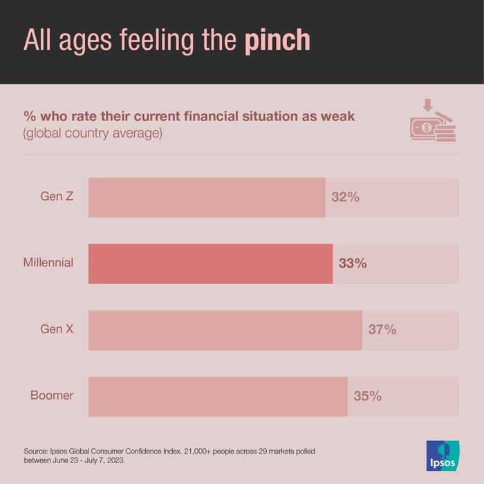 益普索2023年7月发布的月度全球消费者信心指数显示,在29个经济体中,平均有33%的千禧一代认为自己目前的财务状况不佳,与婴儿潮一代(35%)、X世代(37%)和Z世代(32%)基本一致。
