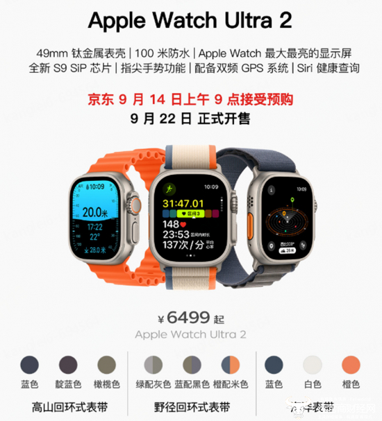 Apple Watch Ultra 2搭载全新S9 SiP芯片,支持奇妙新体验“双指互点两下”手势,配备Apple迄今最明亮的显示屏,扩展了适用海拔高度范围,支持设备端处理Siri请求、用于iPhone的精确查找,以及涉水探险活动等户外功能。Apple Watch Ultra 2常规使用下可实现36小时的电池续航时间,低电量模式下长达72小时。Apple Watch Ultra 2售价为6499元,Apple产品京东自营旗舰店将于9月14日9点开启预售,9月22日起正式发售。