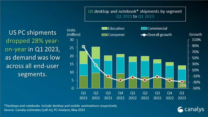 JPR 的报告与分析公司 Canalys 最近的预测一致,即 PC 市场将于 2023 年晚些时候开始复苏。该公司指出,由于所有终端用户需求低迷,台式机和笔记本电脑的出货量在第一季度跌至 1400 万台的低谷,同比下降 28%。
