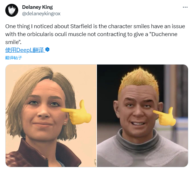 根据Delaney的说法,《星空》中角色的普遍存在眼轮匝肌不会收缩的问题。眼轮匝肌是面部表情肌之一,通常位于眼裂周围,这部分肌肉与丰富的面部表情紧密相连,如果眼轮匝肌不收缩,即便下半张脸在微笑,也会产生一种像是在抗拒微笑的假笑感。