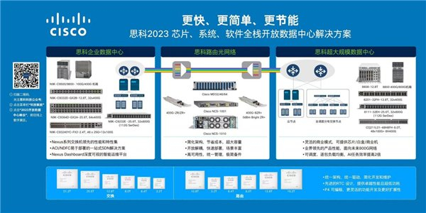 思科2023芯片、系统、软件全栈开放数据中心解决方案亮相本次大会Demo展台,涵盖了思科在芯片、超大规模数据中心、企业数据中心和数据中心互联的路由光网络等众多领域的最新技术成果,为客户带来更快、更简单和更节能的解决方案和产品家族,全方位展现出思科作为全球领先网络解决方案厂商的先进性。