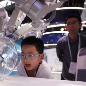 小朋友在2023中关村论坛展览(科博会)上观看单孔腔镜手术机器人剥一枚生鹌鹑蛋。