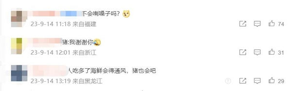 对此,网友留言:“人吃多了海鲜会得痛风,猪也会吧?”、“猪:我谢谢你”、“不扎嘴吗?”。