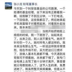 据张小龙所说,他到安信基金进行中报路演时,遭到一名谭姓基金经理怠慢,对方聊天不到五分钟就开始打电话、回信息,随后又照镜子补妆、挤痘痘。张小龙称,他一怒之下离开,得知对方对别人也这样非常气愤,“连做人基本礼貌都不懂”,于是又坐电梯上去骂了对方十分钟才离开。