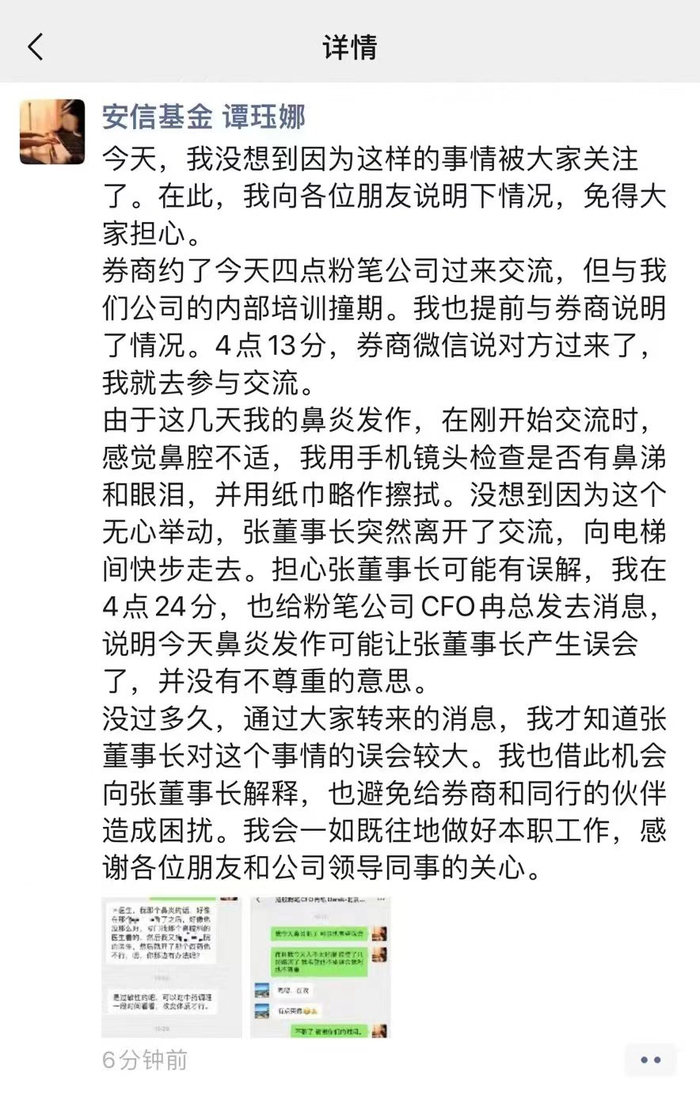 据张小龙晒出的名片,被点名的是安信基金权益投资部基金经理谭珏娜。9月13日晚,谭珏娜也在朋友圈回应称,自己是因鼻炎发作,可能让张小龙产生了误会,已向粉笔公司CFO冉总发去消息解释,“没有不尊重的意思”。