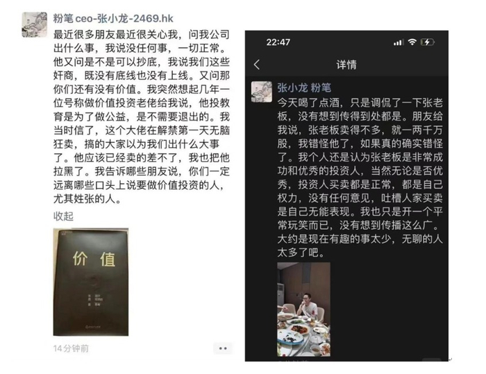 他在朋友圈称,号称做价值投资的大佬曾说投教育是为了做公益,是不需要退出的,但“解禁第一天无脑狂卖,搞得大家以为我们出什么大事了。”张小龙还称,“他应该已经卖得差不多了,我也把他拉黑了……你们一定要远离口头上要做价值投资的人,尤其姓张的人。”虽未点出姓名,但张小龙晒出了张磊写的《价值》一书的照片。