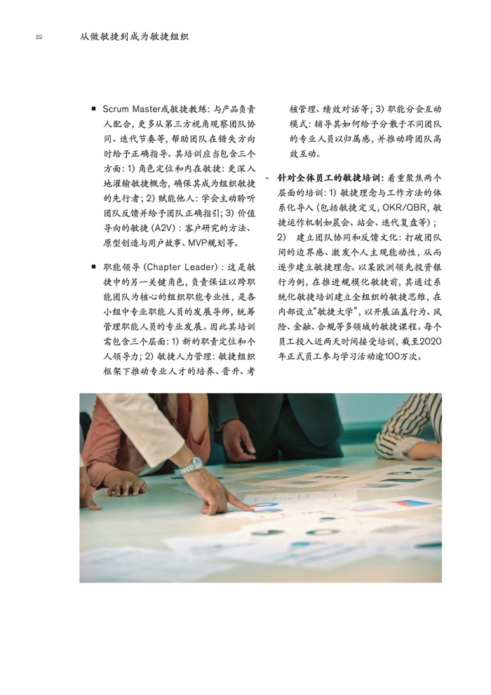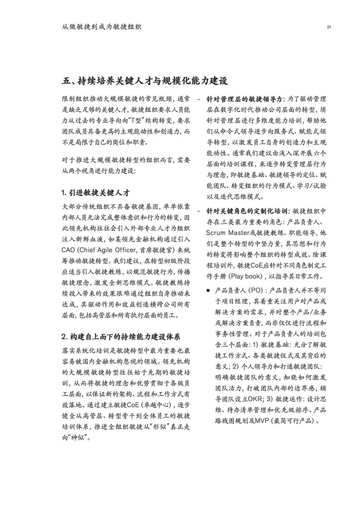 组织转型需要关键角色大幅提升职能,如产品负责人(PO)、敏捷教练(Scrum Master)等具备敏捷管理能力的角色。同时,机构也需要构建体系化培训体系,才能实现大规模团队赋能。