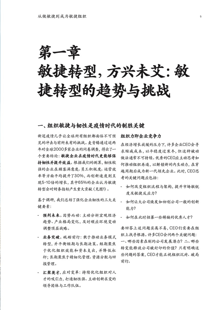 近两年麦肯锡通过对全球2000多家企业的问卷调查,得出一个重要结论:敏捷企业在疫情期间更具韧性并能提升效益。根据我们的测算,韧性较强的企业在顾客满意度、员工积极度、运营效率等方面平均提升了30%,而创新速度则增长5~10倍,其中65%的企业认为敏捷转型会对财务指标产生重大贡献。但我们也发现,不同机构推动敏捷转型的效益存在巨大差异,仅仅引入容易实施的敏捷实践而没有相应进行组织机制调整,往往难以实现预期成果。