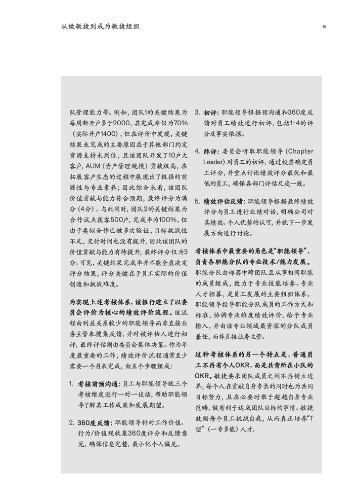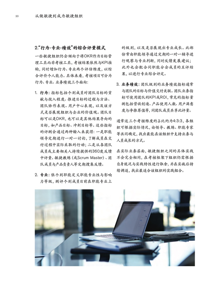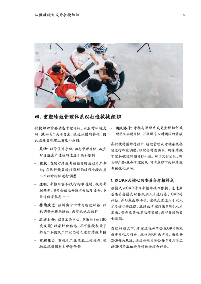 在敏捷转型过程中,绩效管理及考核系统也需要相应调整,以配合转型要求,确保绩效管理和敏捷转型目标一致。对于交付团队,即总部产品/业务管理团队,可考虑以下两种绩效考核优化方向: