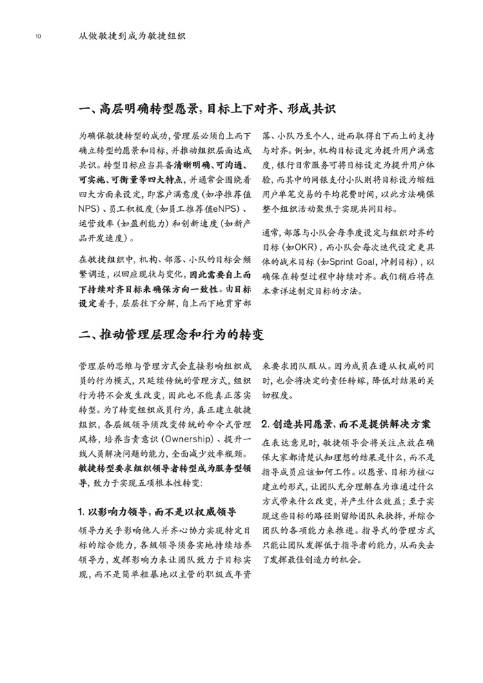 敏捷转型要求组织领导者转型成为服务型领导,除了需要致力于实现五方面的思维与行为改变,包含影响力、树立愿景、鼓励自主、授权当责、管理成果与价值,高阶领导应积极参与并带领组织开展敏捷转型,为组织发展明确方向。具体包括: