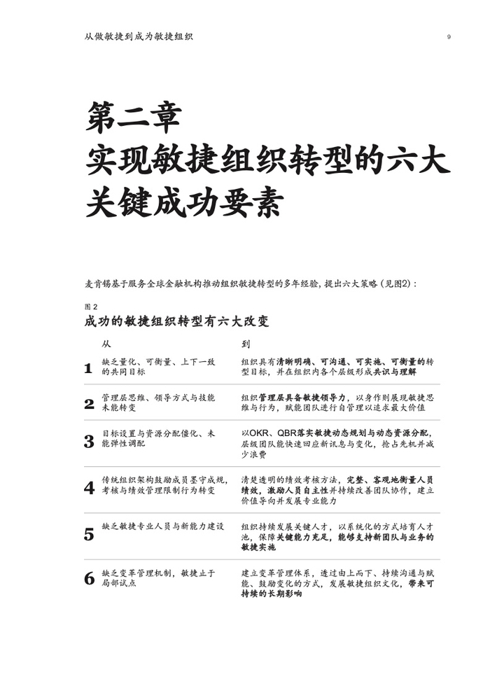 越来越多金融机构也都认识到组织敏捷的重要性。但根据我们观察,中国市场许多金融机构在引入敏捷转型后却出现“形似而神不似”、无法扩大规模、效益不如预期等状况。根本原因是敏捷转型往往停留在“口号”、架构和工作方法的简单调整,在战略、运营流程、人才管理、技术底层等关键领域未能展开有效调整,在组织架构上也无法突破僵固性,无法以价值为导向重塑团队运作方法并赋能团队,导致敏捷转型成效不明显或无疾而终。