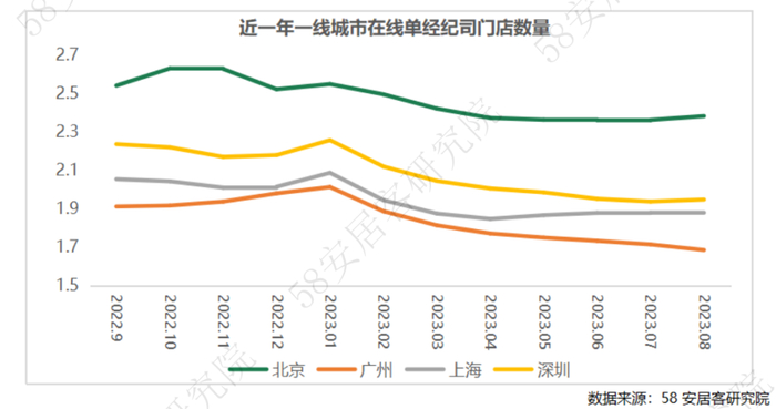 四个一线城市的在线房产经纪门店数量也同步环比下滑,同经纪司数量趋势一致,深圳的减少比例也是最多。