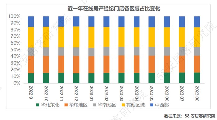 数量上,各个区域在线房产经纪门店数量均有减少,减少量多于7月,四大区域中仍是华东区域减少最多。从区域占比来看,华东区域和华南区域下滑趋势暂时停止,华东区域占比持平,华南区域占比微升;中西部和华北东北区域则从2023年1月至今,门店占比连续上涨8个月。