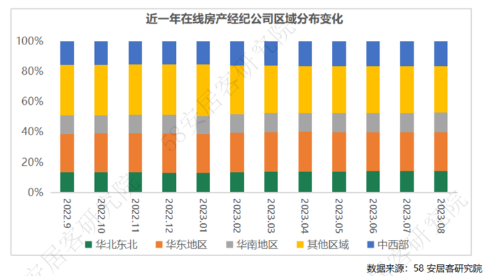 从数量上看,8月各区域在线作业房产经纪公司数量继续减少,其中华东区域减少量最多。从区域分布占比来看,华东区域占比微降0.06%,中西部区域也下降0.02%;反之,华南区域占比小幅上升0.25%,在各区域中上升最多,华北东北区域占比也微升。