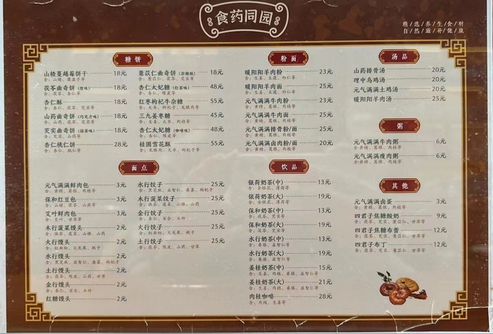 据网上流传的早期菜单,每样奶茶都标明了功效,有健脾益肾奶茶、健脾化湿奶茶等。但如今的菜单上,或许是出于合规的考虑,删去了功效,改名为银荷奶茶、保和奶茶、水行奶茶等,保留了对中药食材成分的说明。