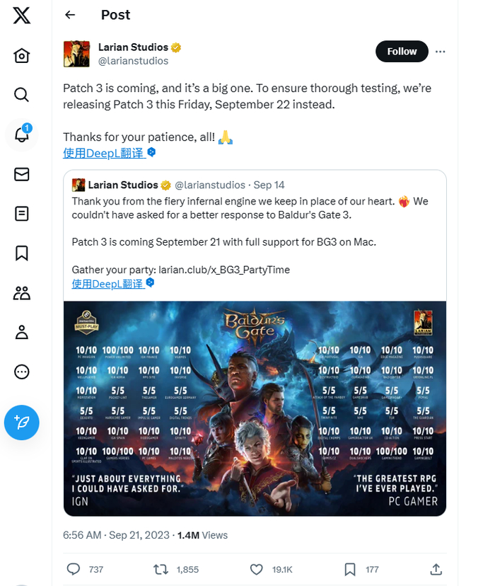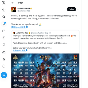 拉瑞安工作室宣布,这个补丁是个“大补”,为了确保其通过测试,补丁比之前预计的日期晚了一天上线。