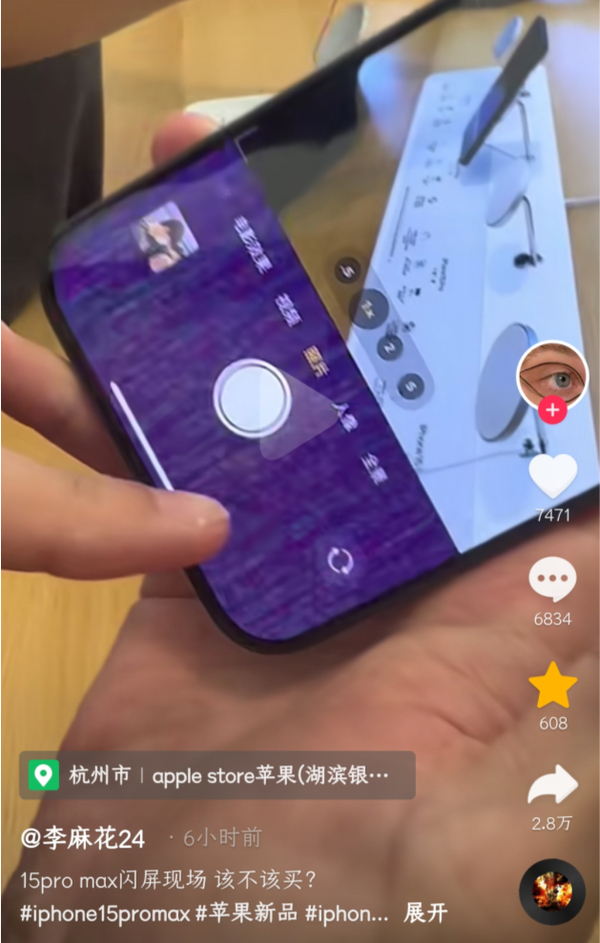 9月22日,有ID为“李麻花24”的网友在抖音上发布了视频,视频中的苹果iPhone 15 Pro Max应该是门店内的展示机,而当消费者打开这款手机的相机界面时,手机屏幕的下半部分区域却出现了闪屏的情况,这明显不正常。目前,暂时不清楚iPhone 15 Pro Max出现闪屏是否是个别情况,是软件问题还是屏幕本身硬件问题。
