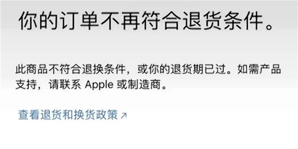 据了解,昨晚有小伙伴进行退货iPhone 15系列时,苹果官网和Apple Store提醒“此商品不符合退还条件。”