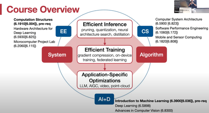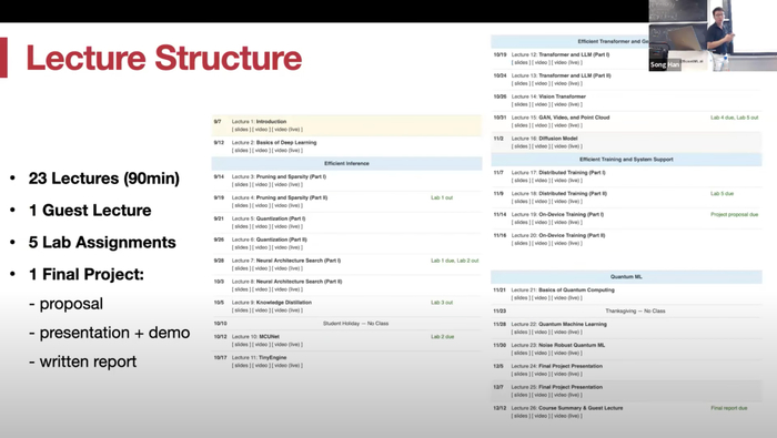 课程主题包括模型压缩、剪枝、量化、神经架构搜索、分布式训练、数据 / 模型并行化、梯度压缩和设备微调,还介绍了针对大语言模型、扩散模型、视频识别和点云的特定应用加速技术,并涵盖了量子机器学习的相关主题。此外,学生将获得在笔记本电脑上部署大型语言模型(如 LLaMA 2)的实践经验。