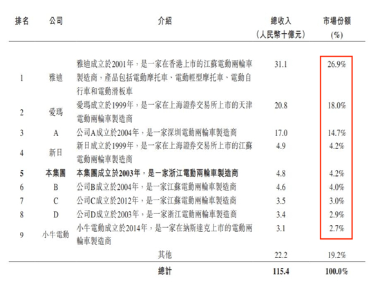 在市场排名上,根据弗若斯特沙利文的资料,以2022年总收益计,绿源是中国内地市场排名第五的电动两轮车制造商,但市场占有率仅为4.2%;而同年,雅迪、爱玛、台铃则分别获得26.9%、18.0%、14.7%的市占率,绿源还不如它们的一个零头。