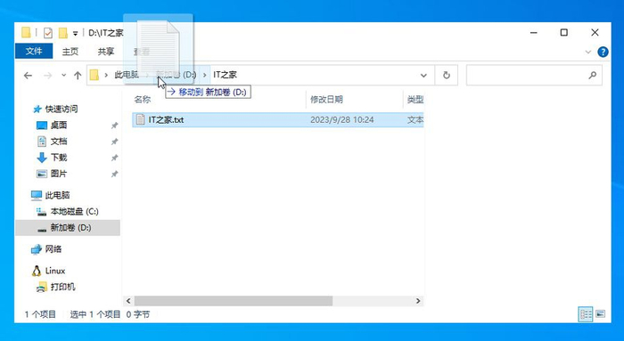 例如你在 D 盘“IT之家”文件夹下,有个“IT之家.txt”文件,你可以用鼠标拖拽“IT之家.txt”文件到地址栏上,然后可以选择移动到 D 盘。