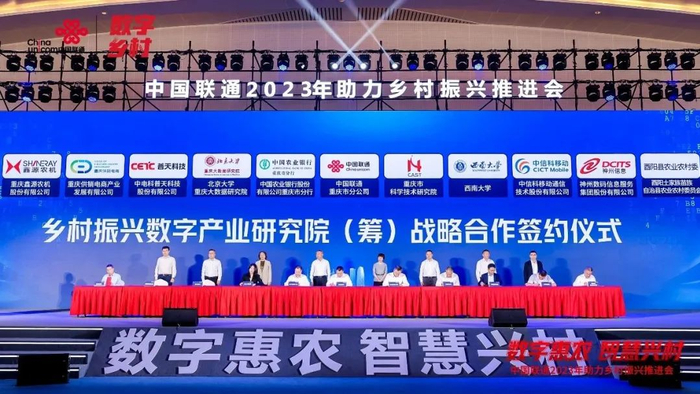其中,中国联通与重庆市人民政府共同启动了乡村振兴数字产业研究院项目。该研究院将立足川渝、服务全国。中国联通重庆市分公司以此为契机,联合行业头部企业、重点高校及科研院所等战略合作伙伴在会上举行了集中签约仪式。