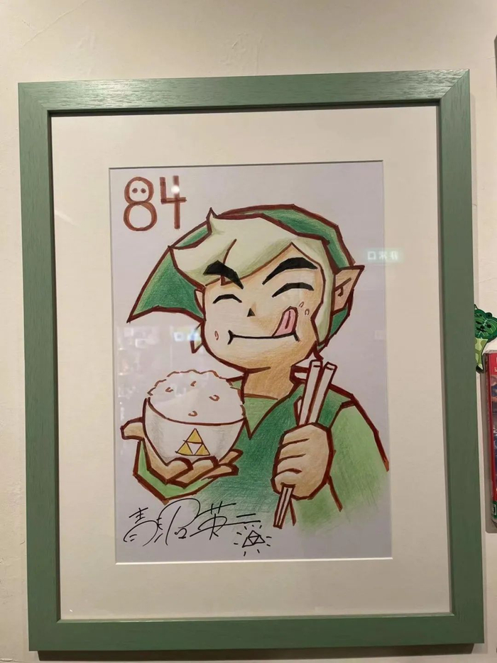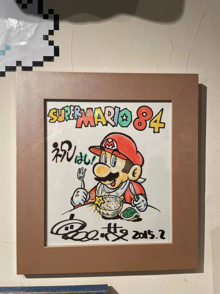 比如正对房门的一整面墙,有“马里奥之父”宫本茂、《塞尔达传说》系列制作人青沼英二的签名和签绘,带有店名元素的马里奥干饭图和林克干饭图都可以说是独一无二的;正中间的手写《超级马里奥》主题曲乐谱,出自作曲家近藤浩治之手,他也是1984年加入任天堂的;《星之卡比》系列的几名主创三津原敏、熊崎信也、上武理志,《星际火狐》系列制作人今村孝矢等人也都留下了几个签名……当然不只是任天堂游戏,右侧墙面还能看到稻船敬二、上田文人等人的作品和签名,甚至有一张Toby Fox的《Undertale》签名Switch版游戏。