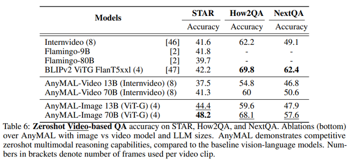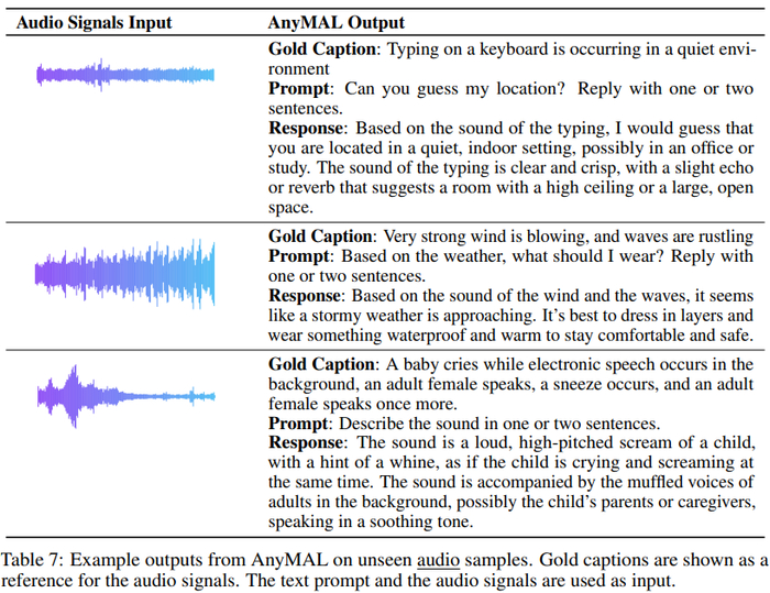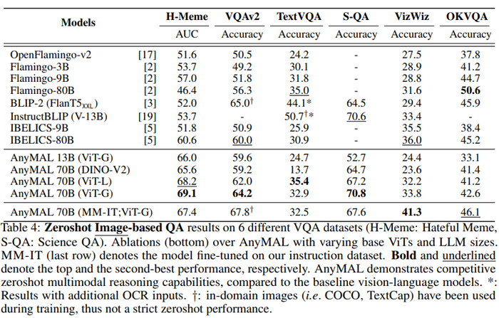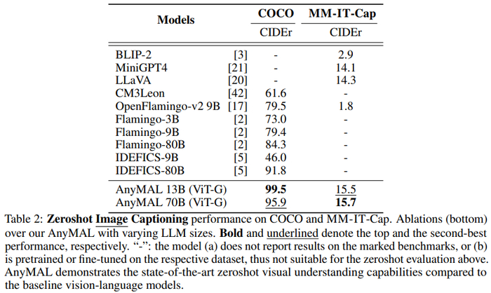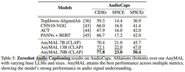 ],这样响应目标就同时以文本指令和模态输入为基础。研究对以下两种情况进行消减:(1)在不改变 LLM 参数的情况下训练投影层;或(2)使用低级适应(Low-Rank Adaptation)进一步调整 LM 行为。研究同时使用人工收集的指令调整数据集和合成数据。 实验及结果 图像标题生成 表 2 显示了在 COCO 和标有「详细描述」 任务(MM-IT-Cap)的 MM-IT 数据集子集上的零样本图像字幕生成性能。可以看出, AnyMAL 变体在这两个数据集上的表现都明显优于基线。值得注意的是,AnyMAL-13B 和 AnyMAL-70B 变体的性能没有明显差距。这一结果表明,底层 LLM 能力对图像标题生成任务的影响较小,但在很大程度上取决于数据规模和配准方法。 多模态推理任务的人工评估 图 3 显示,与基线(LLaVA:34.4% 的胜率和 MiniGPT4:27.0% 的胜率)相比,AnyMAL 性能强劲,与人工标注的实际样本的差距较小(41.1% 的胜率)。值得注意的是,使用完整指令集微调的模型表现出最高的优先胜率,显示出与人类标注的响应相当的视觉理解和推理能力。还值得注意的是,BLIP-2 和 InstructBLIP 在这些开放式查询中表现不佳(分别为 4.1% 和 16.7% 的优先胜出率),尽管它们在公开的 VQA 基准测试中表现出色(见表 4)。 VQA 基准 表 4 显示了在 Hateful Meme 数据集 、VQAv2 、TextVQA 、ScienceQA、VizWiz 和 OKVQA 上的零样本性能,与文献中报告了各自基准上零样本结果的模型进行了比较。研究将重点放在零样本评估上,以便在推理时最好地估计模型在开放式查询上的性能。 视频 QA 基准 如表 6 所示,研究在三个具有挑战性的视频 QA 基准上对模型进行了评估。 音频字幕生成 表 5 显示了 AudioCaps 基准数据集上的音频字幕生成结果。AnyMAL 的表现明显优于文献中其他最先进的音频字幕模型(例如,CIDEr +10.9pp,SPICE +5.8pp),这表明所提出的方法不仅适用于视觉,还适用于各种模态。与 7B 和 13B 变体相比,文本 70B 模型表现出了明显的优势。 有趣的是,有人从 AnyMAL 论文提交的方式、类型和时间推测,Meta 似乎正计划通过其新推出的混合现实 / 元宇宙头显来收集多模态数据。说不定这些研究成果在未来会被整合到 Meta 的元宇宙产品线里,或很快进入消费级应用。 更多详细内容请阅读原文。