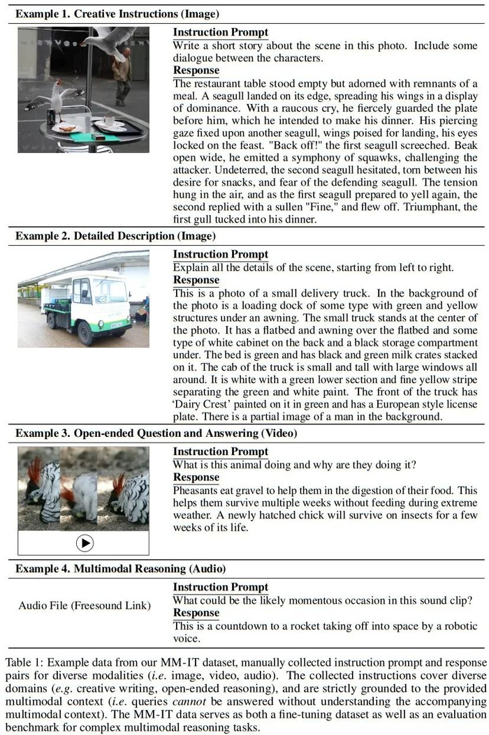 本文利用跨三种模式(图像、视频和音频)的多模态指令集对模型进行了进一步微调,涵盖了简单 QA 领域之外的各种不受约束的任务。该数据集具有高质量的人工收集指令数据,因此本文也将其作为复杂多模态推理任务的基准。