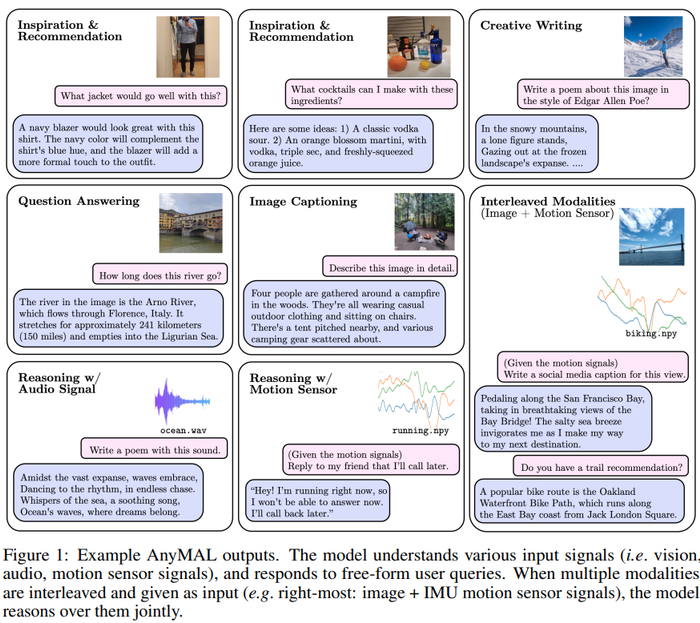 为解决这个问题,来自 Meta 的研究人员近日推出了 AnyMAL(Any-Modality Augmented Language Model)。这是一个经过训练的多模态编码器集合,可将来自各种模态(包括图像、视频、音频和 IMU 运动传感器数据)的数据转换到 LLM 的文本嵌入空间。