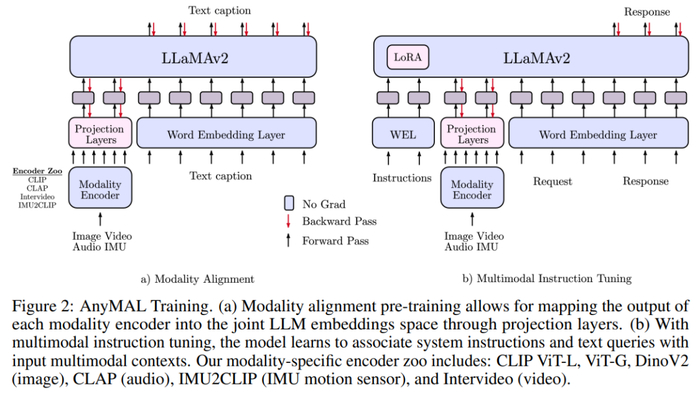 为构建多模态 LLM 提出了一种高效、可扩展的解决方案。本文提供了在大型数据集上预先训练的投影层,这些数据集包含多种模态(例如,2 亿张图像、220 万段音频、50 万 IMU 时间序列、2800 万段视频),所有数据集都与同一个大模型(LLaMA-2- 70B-chat)对齐,从而实现了交错式多模态上下文提示。