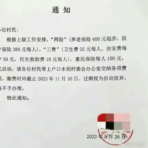 这份通知中的“两险”要求村民缴纳养老保险和医疗保险的费用,其中养老保险400元起步,医疗保险为每人380元。另外,“三费”则引起网友的不解,通知称卫生费每人35元,治安费每户50元,民生救助费每人10元,缴费时间截止至2023年11月30日。