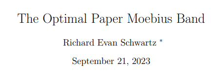 他在 2023 年 8 月 24 日发布在 arXiv.org 上的一份预印本论文中证明了 Halpern-Weaver 猜想。他证明了用纸制成的「嵌入的」莫比乌斯带只能以大于的纵横比构造出来。例如,如果带子长度为 1 厘米,它的宽必须要大于厘米。