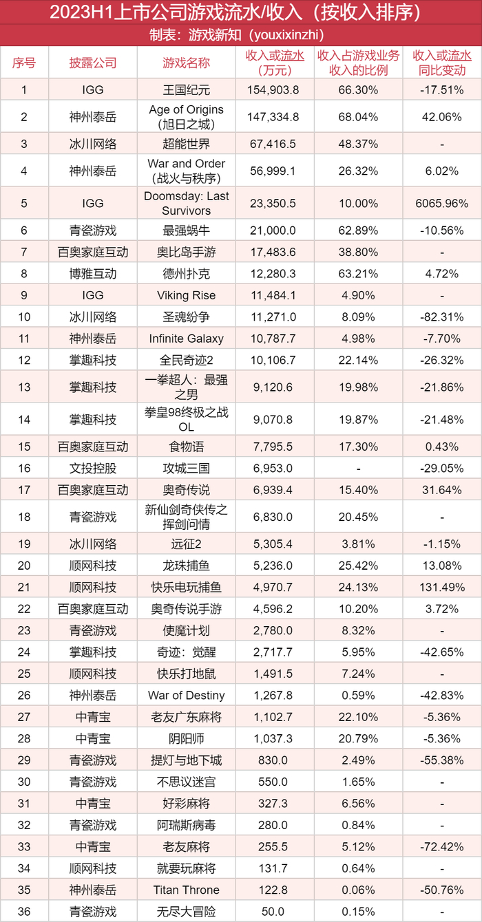 在披露的这些游戏中,有14款流水过亿。榜单的前列多数都是熟面孔,如IGG的《王国纪元》、神州泰岳的《旭日之城》《战火与秩序》、青瓷游戏的《最强蜗牛》。