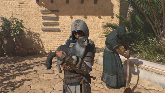 除了场景的复古,游戏规模也适当缩小了一些,不再提供“神话”三部曲(《刺客信条:起源》《刺客信条:奥德赛》《刺客信条:英灵殿》)那样夸张的巨大地图,游戏中能够探索的区域只是被沙漠包围的城市,城市规模也不算很大。游戏里提供一些支线活动,像是世界合约任务、短小精悍的巴格达故事、收集和地点探索,还有寻找带刺客徽章标记的猫猫…… 确实有一些填充地图的支线,又不是很多,相对过去几代游戏算是相当克制。