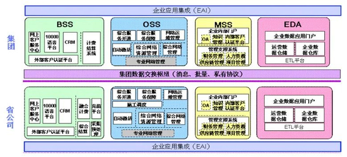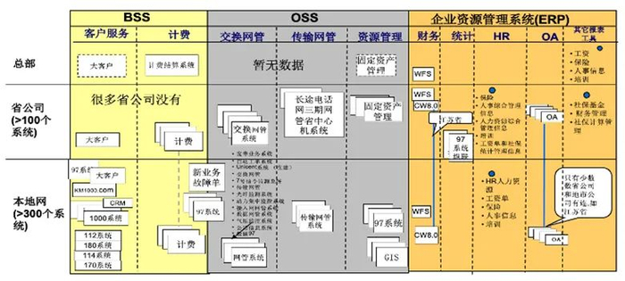 据C114观察,中国移动从2001年起开始建设全省集中、一体化的业务运营支撑系统(BOSS);中国电信各省公司从2003年起陆续按照企业信息化战略规划(ITSP)的思路开始规划自身的BSS/OSS系统;中国联通BSS也是以省为中心分别建设各个子系统,包括综合营账、综合结算、专业计费、客服等。