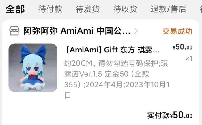 官方渠道也有缺点,第一是要等,第二是不一定能等到自己想要的fumo,官方决定生产哪种fumo款式完全随缘。反正琪露诺fumo我要定了,便下单了一只,预计明年愚人节发货。