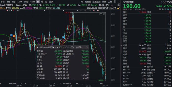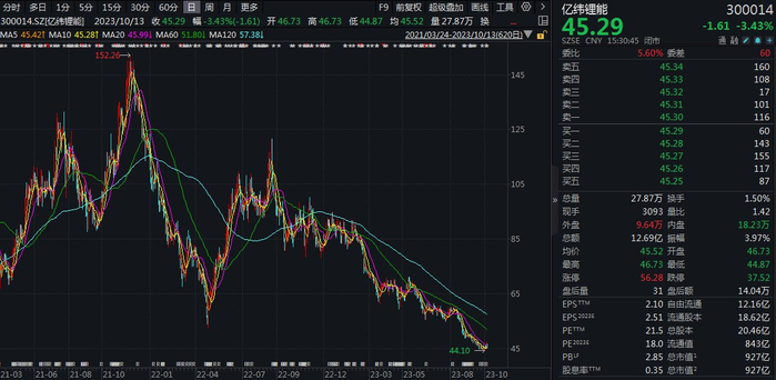 A股两大锂电龙头近期股价走势低迷,8月中旬以来,宁德时代股价持续走低,目前已跌超20%,10月13日一度跌穿190元/股,创下2021年5月以来新低;亿纬锂能在2023年初走出股价震荡后持续下跌,在10月13日再度跌穿45元/股,创2020年9月以来新低。