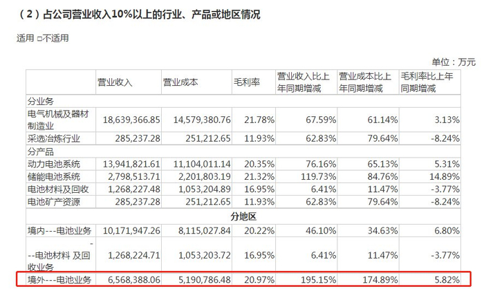 从毛利率看,宁德时代境内电池业务毛利率为20.22%,同比提升6.8个百分点;境外电池业务毛利率为20.97%,同比提升5.82个百分点。公司境内外电池业务毛利率相仿。