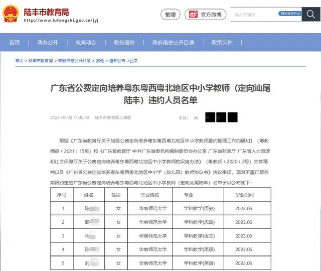 近日,广东省陆丰市教育局发布《广东省公费定向培养粤东粤西粤北地区中小学教师(定向汕尾陆丰)违约人员名单》,名单显示,共有5名毕业生未履约,毕业时间为2023年6月。而类似的事并非一起,广东省雷州市教育局也公布了公费定向培养对象违约人员名单。