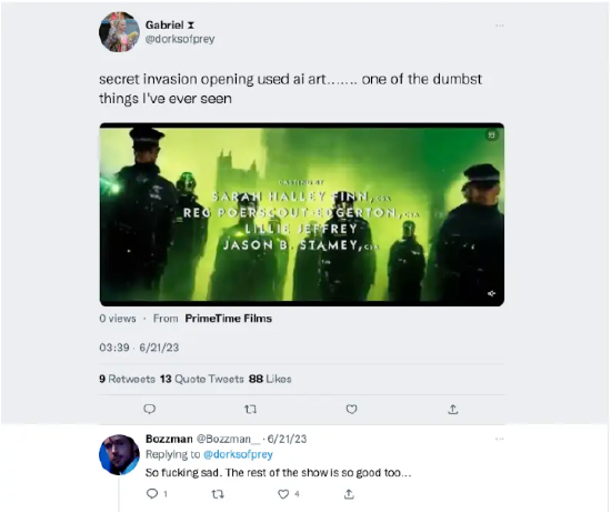 制作《秘密入侵》的Method Studio当时发表声明,承认他们的确使用了“特定的AI工具”来展现外太空与异形的形象,但Method Studio强调“这些新工具并没有取代艺术家的工作”。