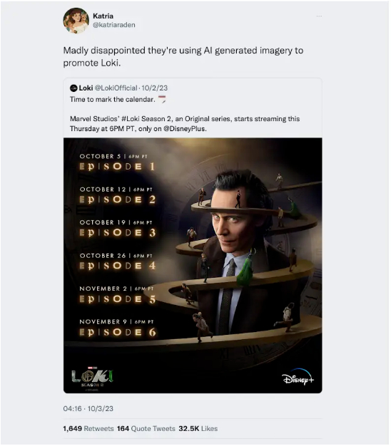 虽然这次迪士尼否认《洛基》海报是AI生成的,但AI生成内容就像是一根刺,扎在影视从业人员的心里。每次看到疑似生成式AI生成的内容,都会拨动到他们紧张的神经。