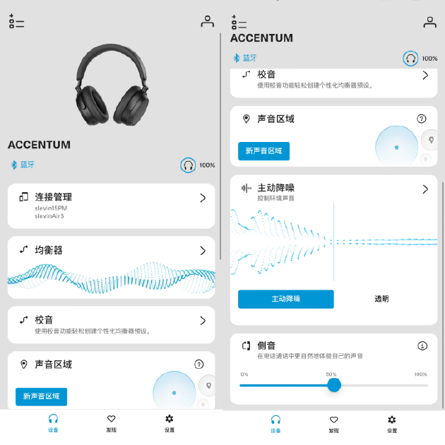 首先是主动降噪的功能,我们的评价是优秀。相比耳塞式主动降噪耳机,这类头戴式耳机天生具备一定优势,耳罩就可以帮他们摆脱部分噪音。当然,也因为耳罩的缘故,头戴式耳机多少都会有闷热感觉,对ACCENTUM来说也是如此。