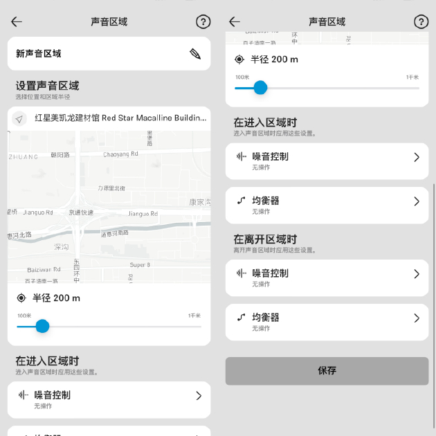 这个App的另一个有趣功能是“声音区域”,根据用户位置切换不同的声音场景,例如在家,看电影比较多,可以是降噪关+电影均衡器;离开这个范围,通勤路上则是降噪开+音乐。