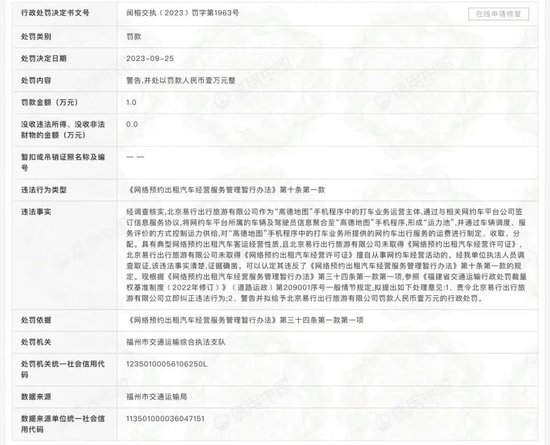 福州市交通运输局的行政处罚决定书中提到,上述行为具有典型网络预约出租汽⻋客运经营性质,且北京易行出行旅游有限公司未取得《网络预约出租汽⻋经营许可证》,北京易行出行旅游有限公司未取得《网络预约出租汽⻋经营许可证》擅自从事网约⻋经营活动的。经调查取证,该违法事实清楚,证据确凿,认定其违反了《网络预约出租汽⻋经营服务管理暂行办法》第十条第一款的规定,责令北京易行出行旅游有限公司立即纠正违法行为,警告并拟给予北京易行出行旅游有限公司罚款人⺠币壹万元的行政处罚。