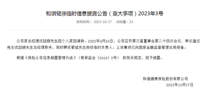 和谐健康已于2023年9月28日召开第三届董事会第二十四次会议,审议通过免去沈喆颋总经理职务,同时聘任管斌担任临时负责人。上述事项已向国家金融监督管理总局报备。