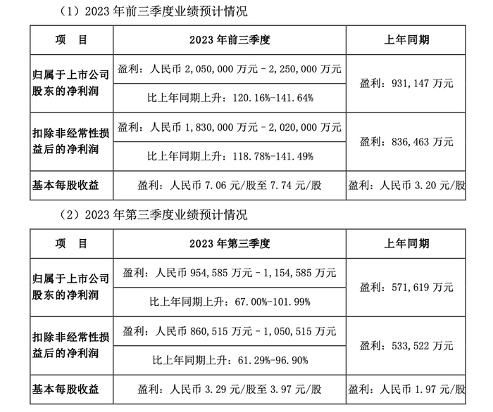 今年前三季度,比亚迪预计净利润为205亿元-225亿元,同比增长120.16%-141.64%;扣除非经常性损益后的净利润183亿元-202亿元,同比增长118.78%-141.49%;基本每股收益为7.06元/股-7.74元/股,去年同期为3.2元/股。