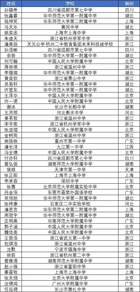 如果从学校层面来看,中国人民大学附属中学与华中师范大学第一附属中学各有7人,温州中学4人。