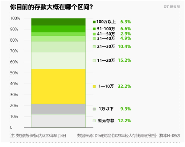 其中,约占比例五分之一的人存款在1万元以内,53.7%的年轻人存款不足10万元。