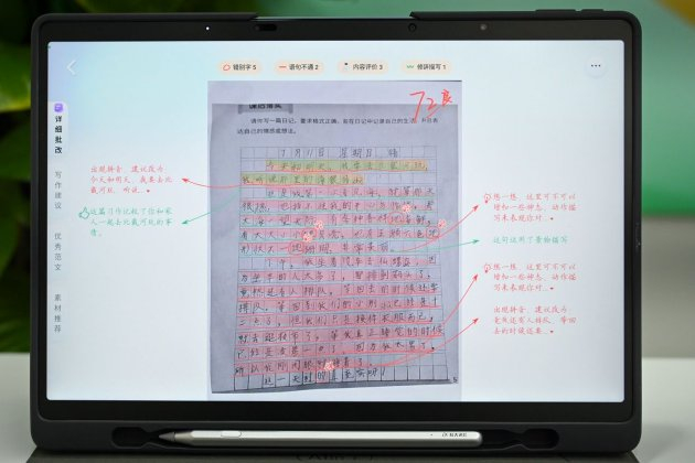 科大讯飞T20 Pro的呈现形式像是在作文纸上进行批改,并且错字、标点识别准确,能批改短句和语病,并且给出错因分析,还能识别到作文中使用的修辞表达、描写手法。
